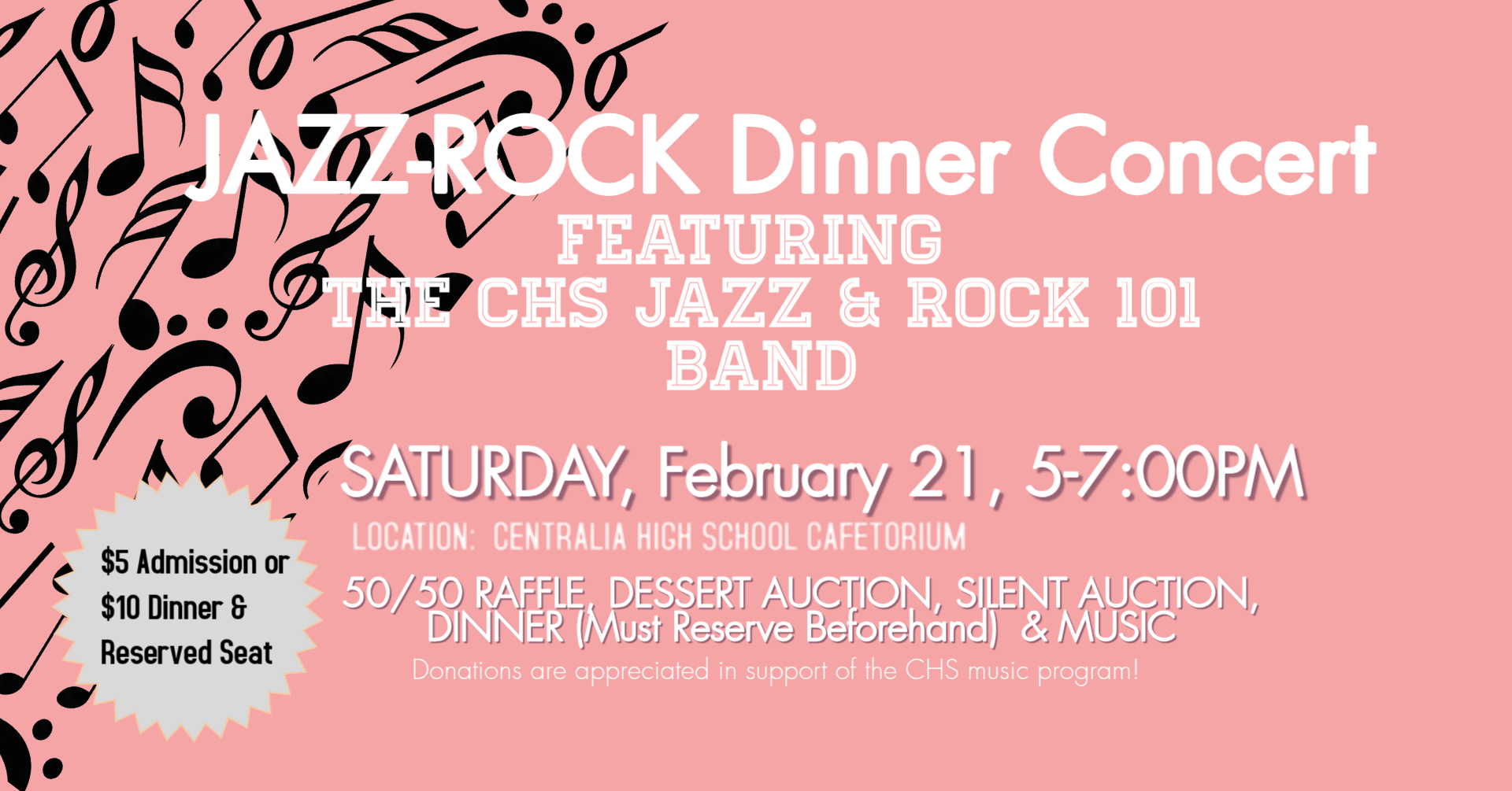 Please join us for our annual Jazz & Rock Bands Dinner concert. Dinner tickets are $10, meal includes: salad, spaghetti, bread stick. A dessert auction, raffle baskets and 50/50 raffle will be held. See a band member or click on link to purchase tickets. General admission (dinner & table seating not included) may be purchased at the door or through the link. https://centraliamusic.ludus.com