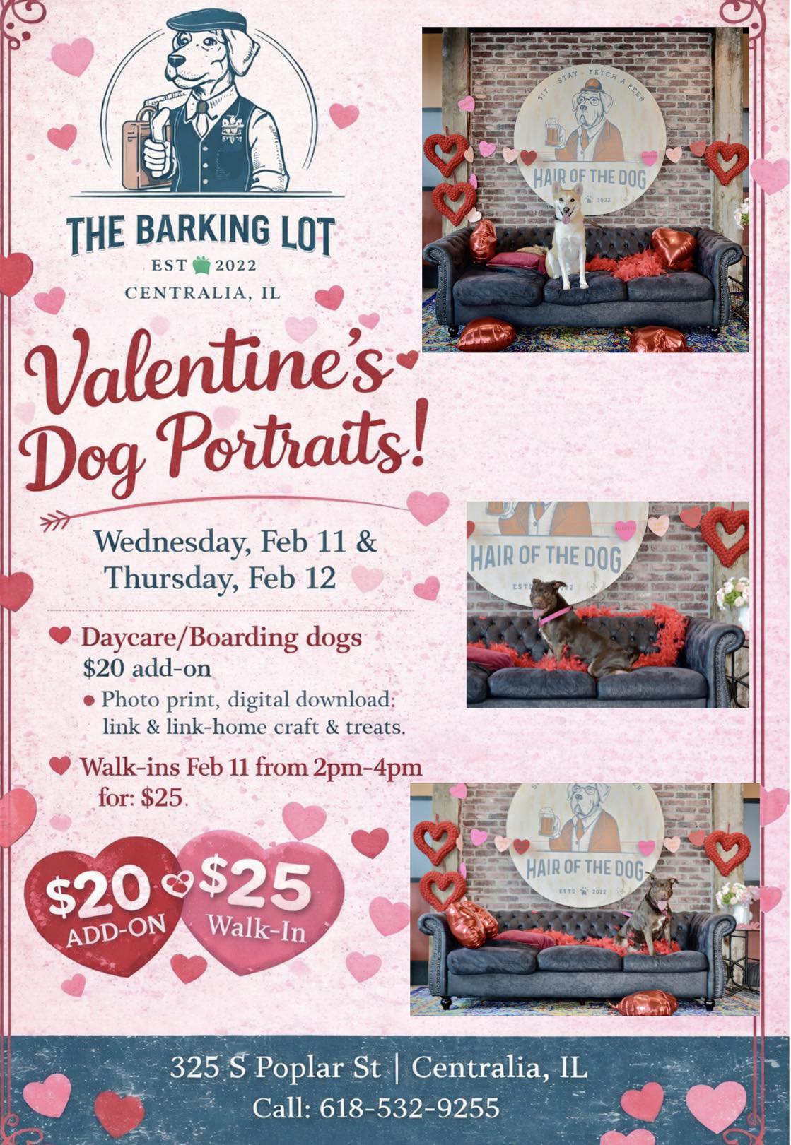 Valentine’s Day dog portraits will be available at The Barking Lot in Centralia on Wednesday, February 11, and Thursday, February 12.