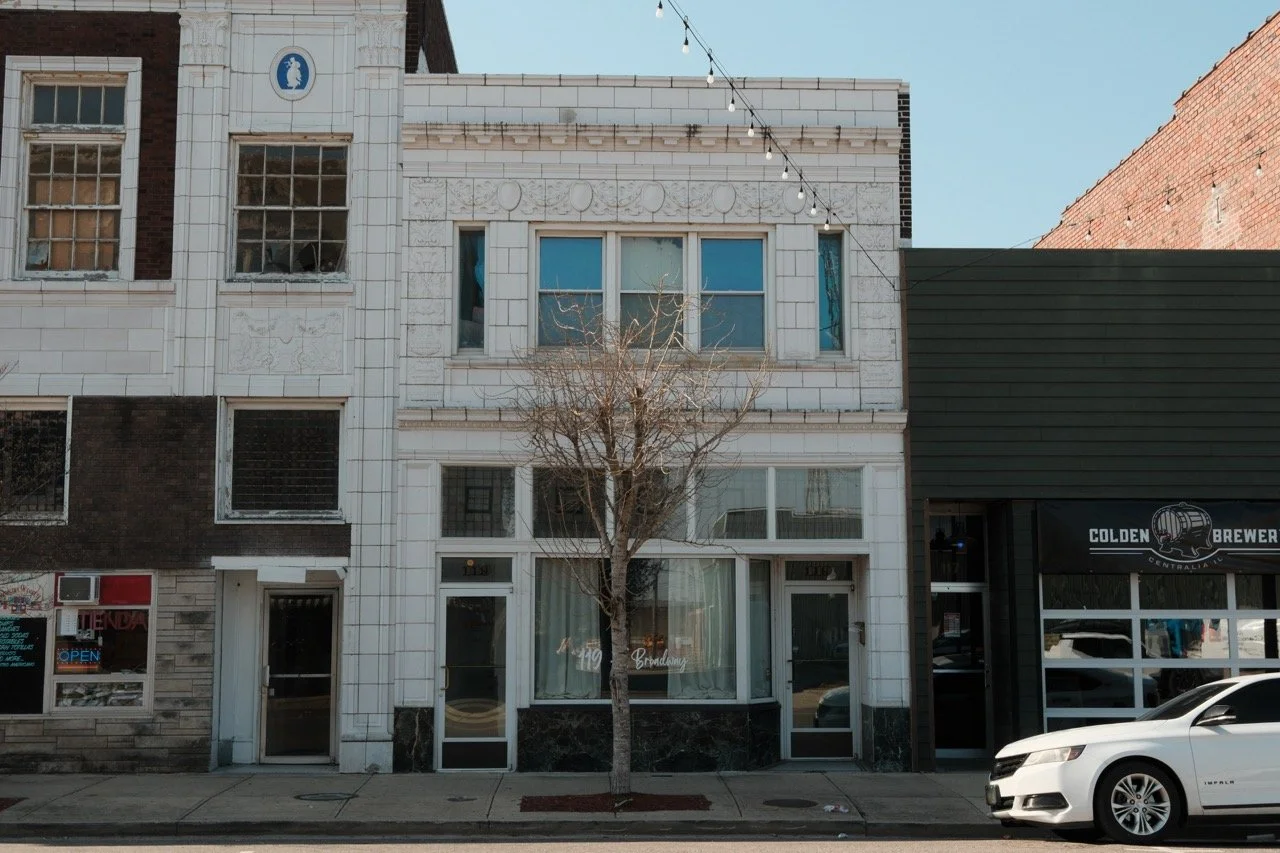 This two-story brick commercial structure’s first floor storefronts have been replaced with a. series of arched openings heated in diagonal wood siding. Although the building was not constructed until the 1920s, elements of what appears to be an older cast iron storefront have been used in the entrance to 111 and the panels beneath the plate glass windows. The second story presents three bays, each with a group of three double-hung windows. The center group is flanked by two narrow windows; the other groups each present a narrow window on the side nearest the center of the building.