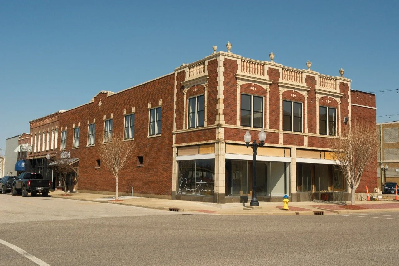 A two-story brown brick commercial building presents elements of the Italian Renaissance Revival Style: Terra cotta quoins, arched window surrounds, balustrades and urns decorate the second floor of the building’s primary facade, while the ground floor’s granite, terra cotta and glass storefront is clearly a no-nonsense commercial design.