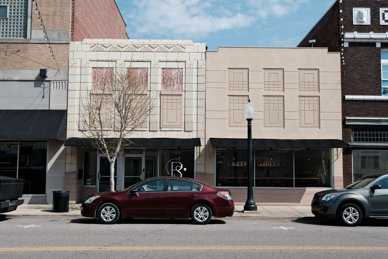 This two-story brick building with Art Deco details presents a contemporary storefront of plate glass and aluminum. A composite material is used below the plate glass windows and to fill the window area above the fabric awning. Plain limestone frames the storefront on the sides and top.