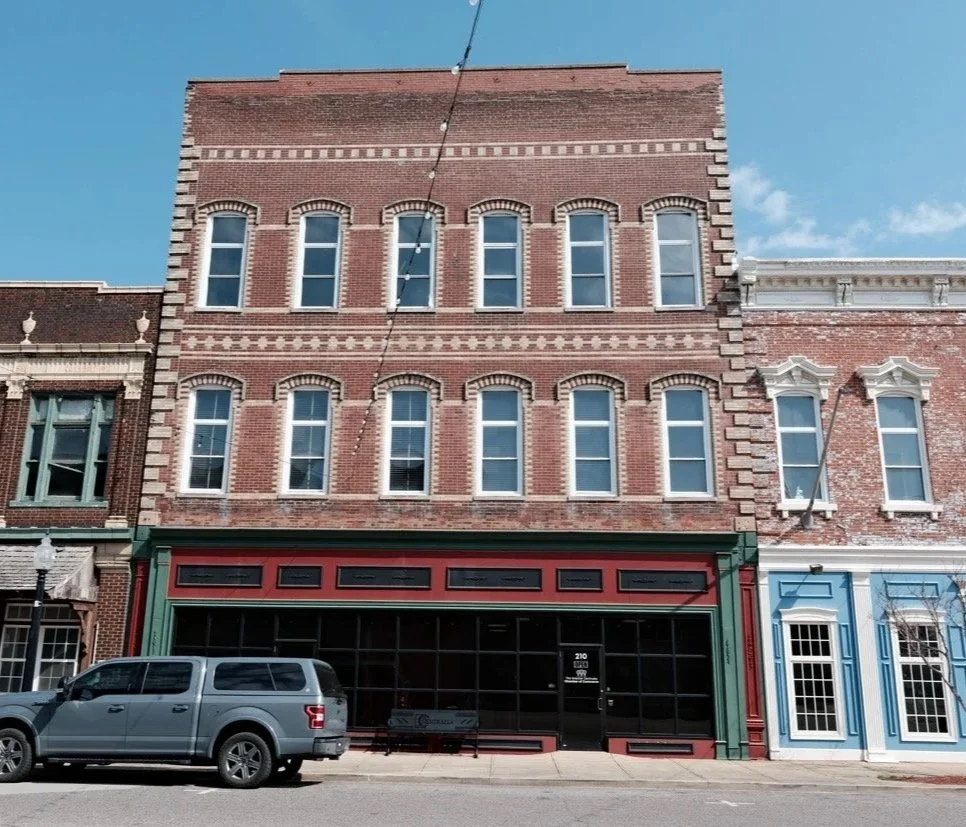 This two story building presents a contemporary storefront of wood and glass, featuring a number of six-over-six double-hung vinyl windows. A fixed awning of wood and wooden shingles separates the first and second stories, ending at a terra cotta cornice that has been painted green.