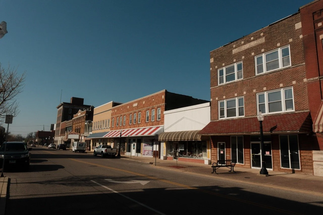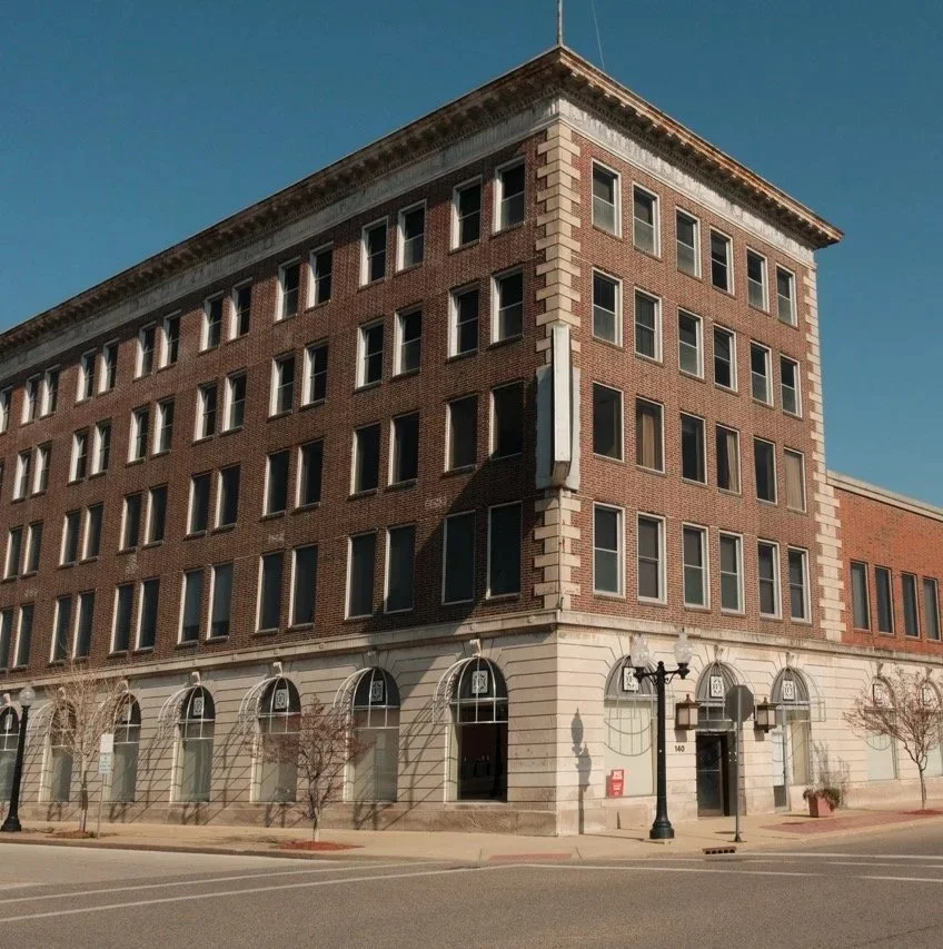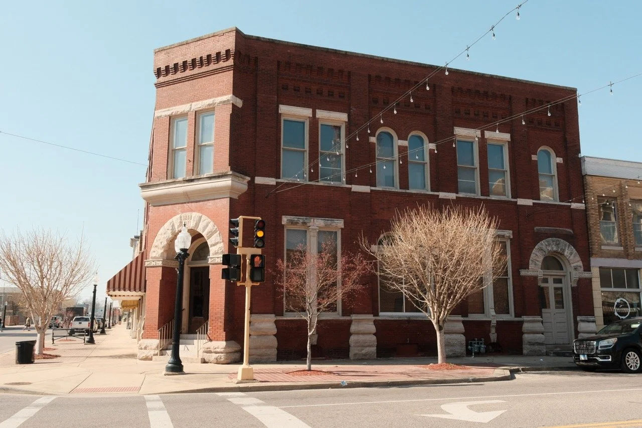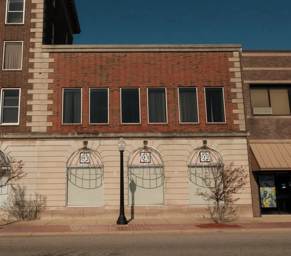 The central bay, facing the corner of Broadway and Locust, presents an entry framed by a Roman arch of rusticated stone. At the second floor, the bay presents two double-hung windows with a single lintel of rusticated stone that stretches across the bay. Above this, a simple parapet with corbeling and machicolations ends in a flat parapet, a design that simplifies the original complex brickwork that decorated the cornice of the building. A single bay along Broadway Street retains the original simple Roman arch and second floor window arrangement.