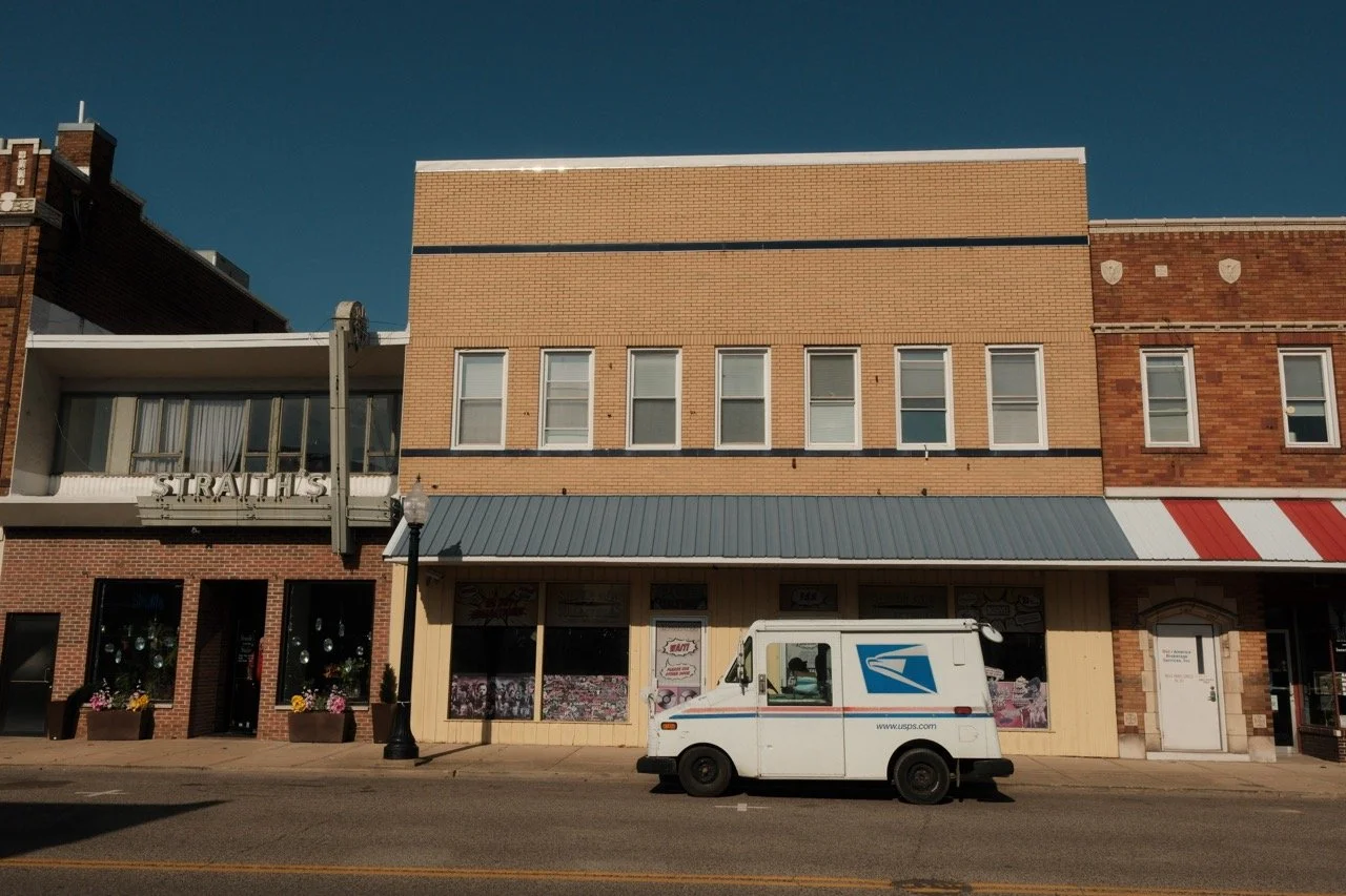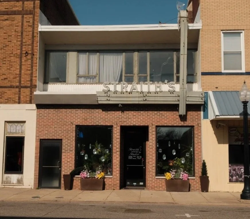 As a 1945 building in the International Style, Straith’s Jewelry maintains its distinctive aluminum and neon sign and line of windows with slender metal frames stretching across the second floor. The storefront, however, has been covered with contemporary brick, its expanse of windows replaced by an entry flanked by two plate glass windows.