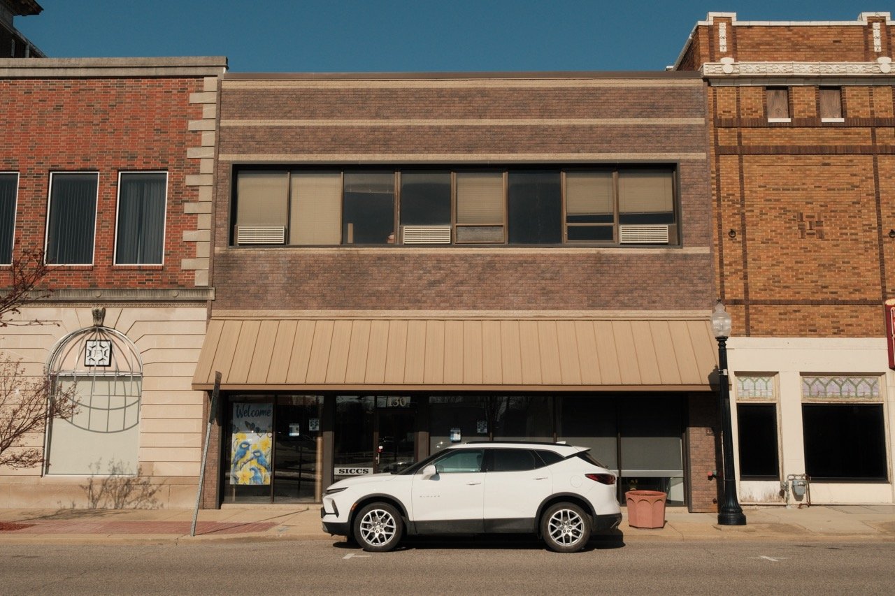 A plain yellow brick two-story commercial structure with blue architectural glass accents and a metal awning. The storefront has been replaced with wooden vertical siding, plate glass and metal and glass doors. The doors to both stores are in the center of the building, with plate glass windows on either side.