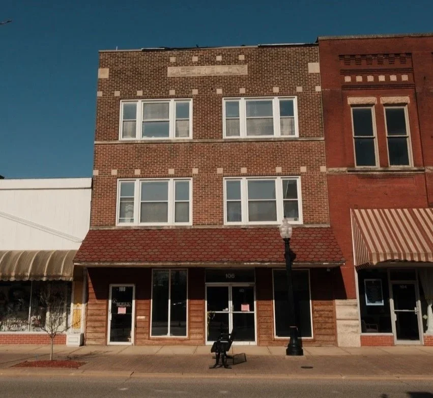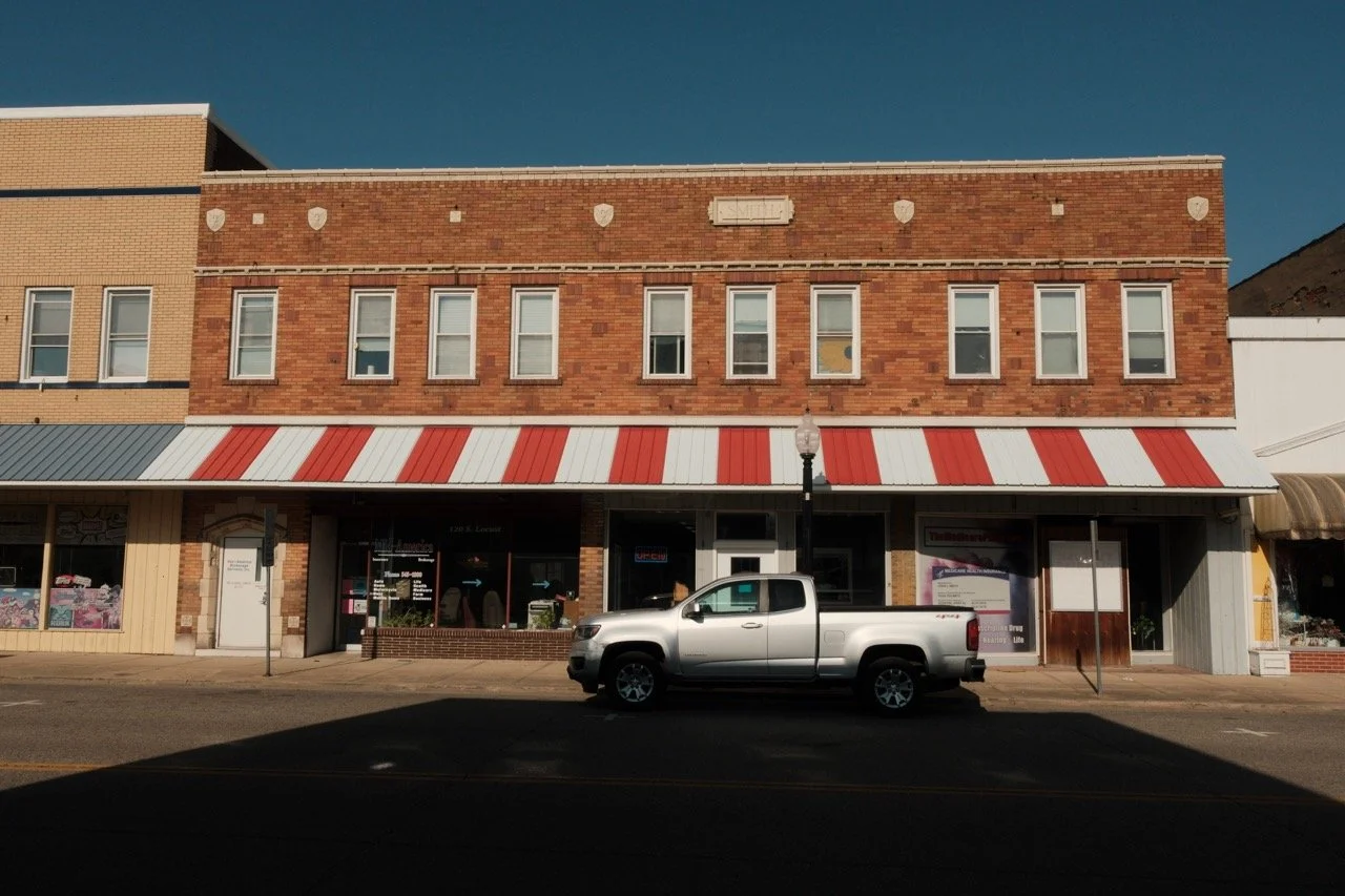 A three-story commercial building of red brick with office or living space above presents two bays of equal size. On the first floor, an asymmetrical arrangement of two windows and two entries provides access to the first floor commercial space and the stairs to the upper floors. A fixed awning of red shingles fills the space between the storefront and the second-floor windows.