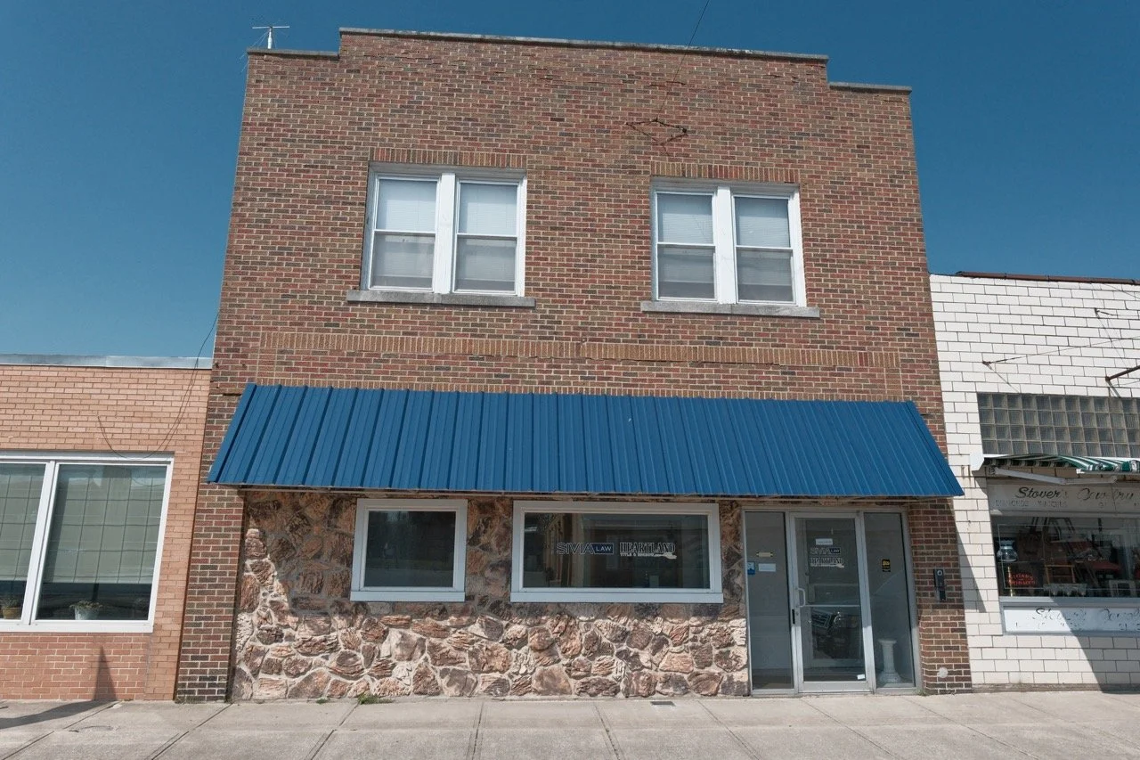 The storefront of this two-story brown brick commercial structure has been filled with fieldstone veneer, leaving three penetrations for a glass and metal entry on the right and two plate glass windows. These three elements are unevenly spaced across the building's façade. The second floor presents two evenly-spaced penetrations, each with two double-hung windows. A simple parapet finished with stone coping, rises five courses higher above the windows.