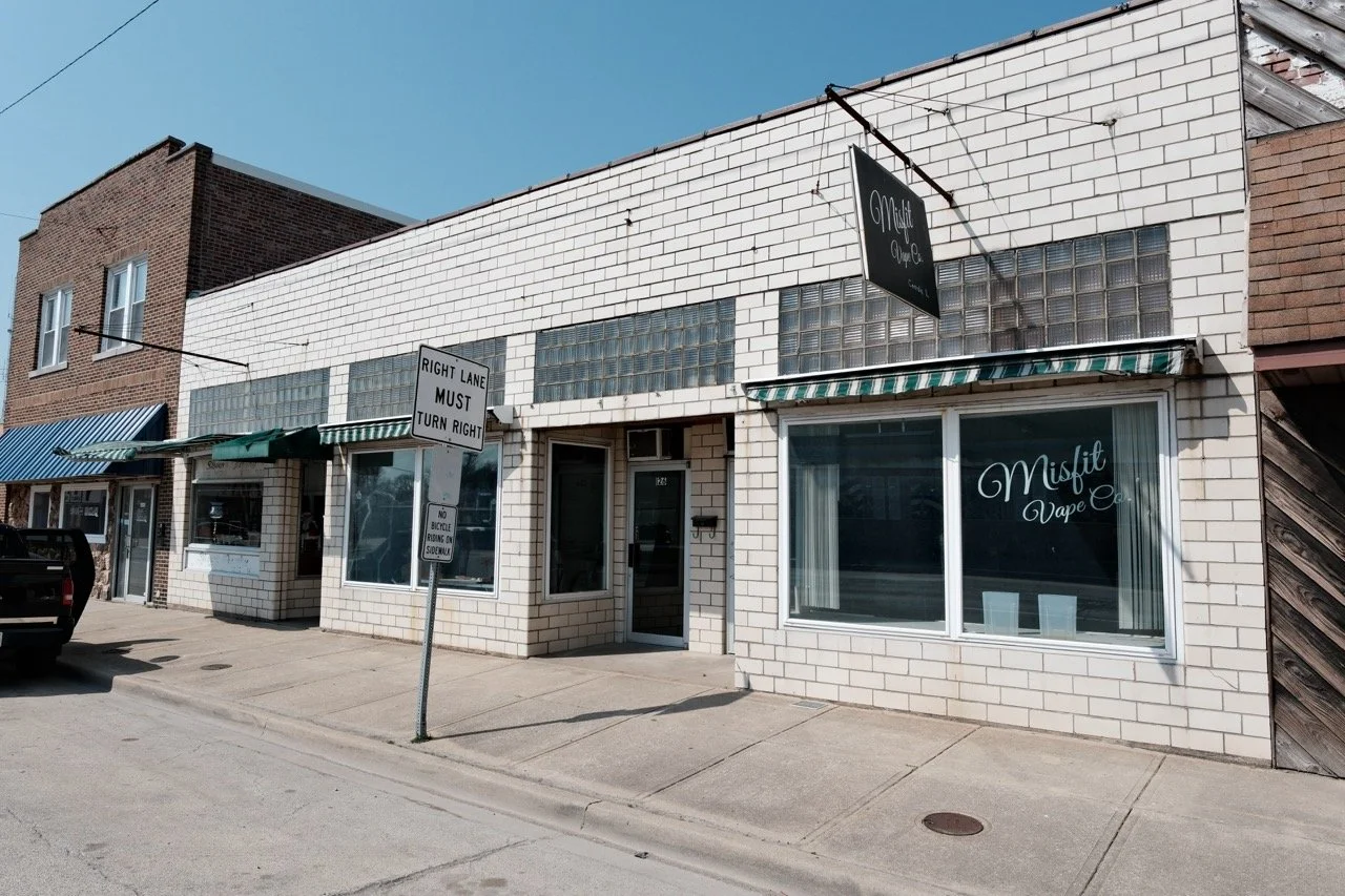 This one-story commercial structure in white glazed brick encompasses three storefronts presented in four bays. The first bay from the left is slightly wider than the others, and presents a metal and glass entry on the right and a plate glass window on the left. A single clerestory window of glass block stretches across both features. The remaining three bays are all roughly the same width, each with a single glass block clerestory window above. The first of these presents two metal-framed plate glass windows, the second, recessed entries for two separate commercial spaces, and the final bay, two plate glass windows. Above the clerestory windows is a plain brick parapet marked in places by previously installed signage.